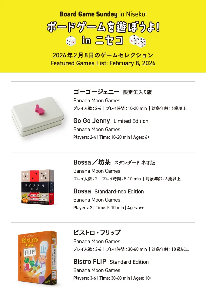 Banana Moon Games will host the board game play event “Board Game Sunday in Niseko!” on Sunday, February 8, 2026, at the Former Starch Factory within the Niseko Central Warehouse Group in Niseko Town, Hokkaido.