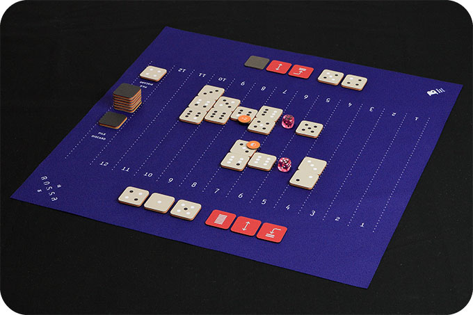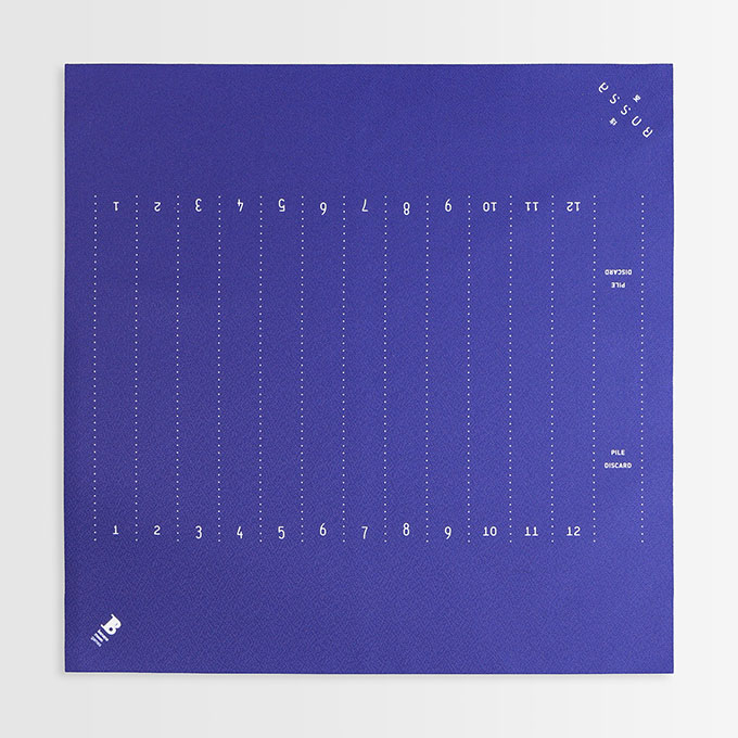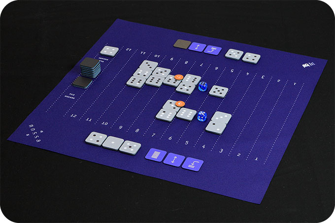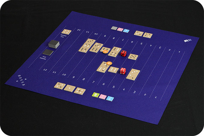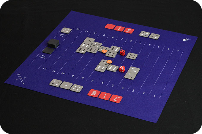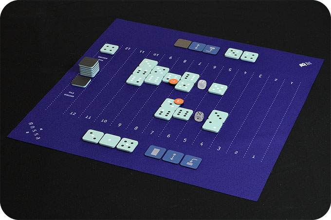 プレイマットの中央部には場の列(1〜12)と山札タイル置き場・捨てタイル置き場がレイアウトされ、各プレイヤーの手前には手札やアクションカード、拡張チップを置くスペースがあります。