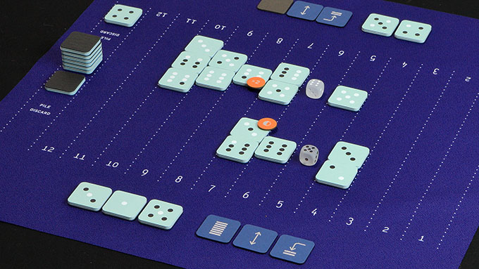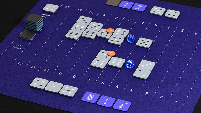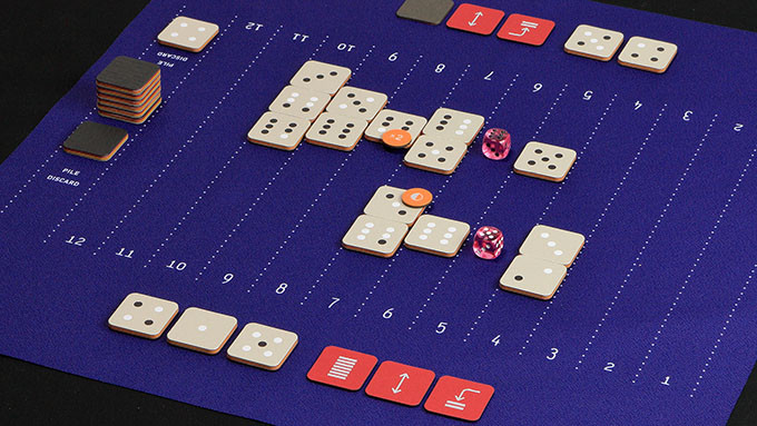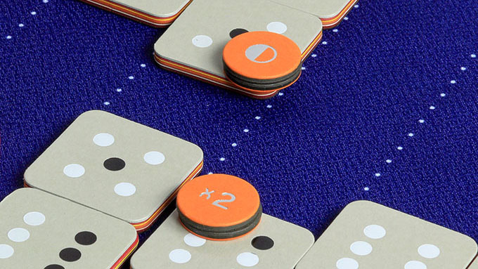 3種のアクション〈リドロー〉〈エクスチェンジ〉〈スタック〉や、2種の変換チップ〈ダブラー〉〈インバーター〉も活用し、手詰まりを避けつつ手札のタイルを場に出していきます。その際、必ず隣のタイルよりも1枚多いか、1枚少ない枚数でなくてはなりません。