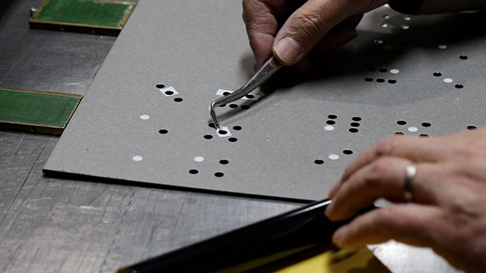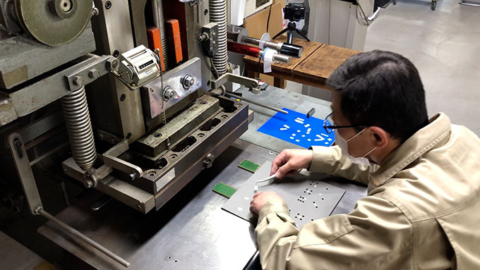 職人によるドットタイルの箔押し工程:匠のアート版