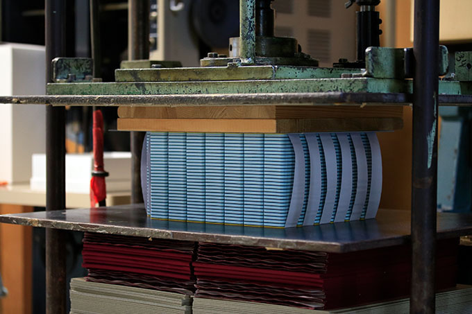職人の指先の感覚で、タイルの断面に心地よい微妙な凹凸ができるよう、9層の紙を貼り合わせていく:匠のアート版